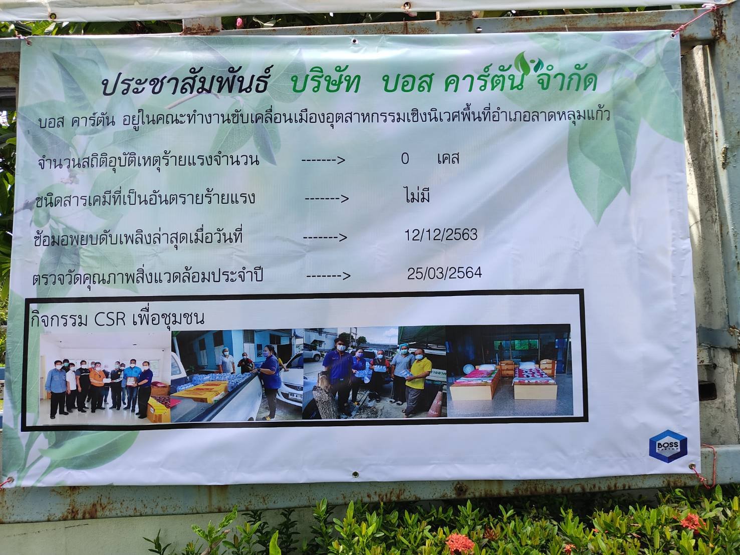 ในการพัฒนาการอยู่ร่วมกันระหว่าง ภาครัฐ เอกชน และโรงงานอุตสหกรรม ให้ทั้งสามส่วนอยู่ร่วมกันได้อย่างเป็นสุข และสนับสนุนเกื้อกูลกันได้ บริษัท บอส คาร์ตัน จำกัด ได้ร่วมเป็นคณะกรรมการพัฒนาเมืองอุตสาหกรรมเชิงนิเวศพื้นที่ลาดหลุมแก้ว และเข้าร่วมโครงการโรงงานอุตสหกรรมเชิงนิเวศที่มีคุณค่าต่อสังคม เพื่อสนับสนุนการยกระดับเมืองประทุมธานี